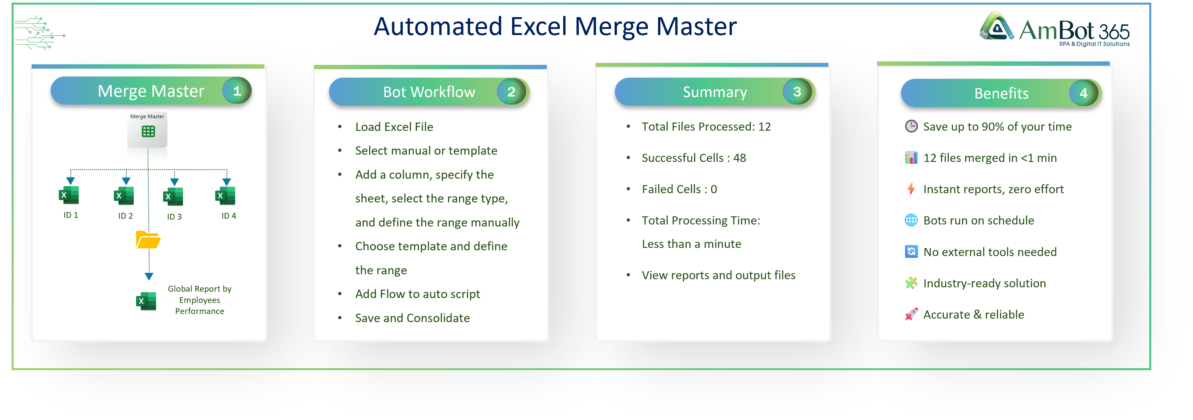 In many business environments, Excel data is spread across various cells, ranges, and multiple workbooks, often leading to time-consuming and error-prone manual processing. Merge Master Bot is an advanced automation tool that intelligently merges and consolidates data from diverse sources into a single structured file. It streamlines the process of report generation and data analysis, enabling teams to work more efficiently with improved data accuracy.