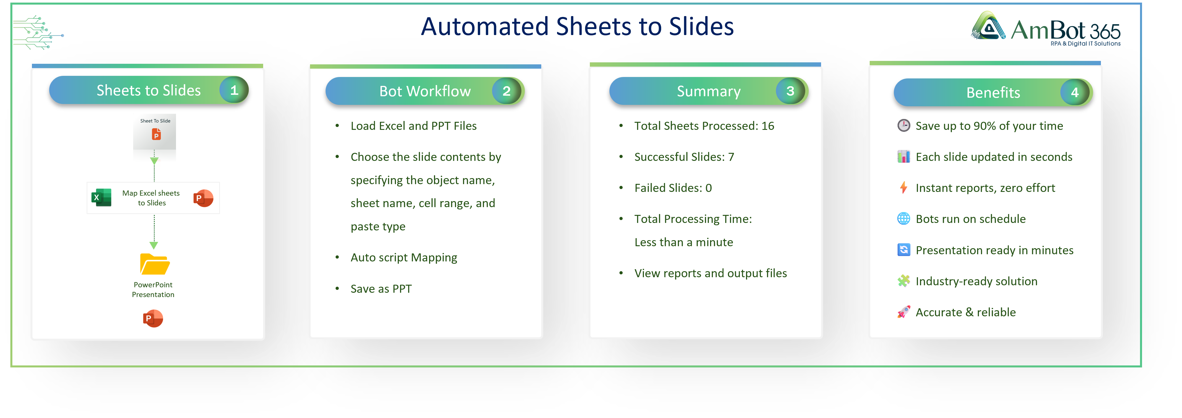 - Automates Excel to PowerPoint conversion with accurate formatting